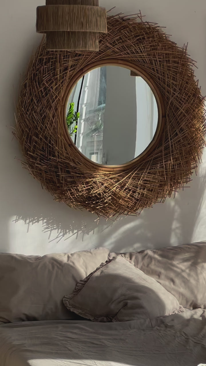The form of the mirror is oval, and the frame is made of a weave of rattan twigs arranged in the shape of a flower. Noteworthy is the combination of unusual materials: glass and rattan - a unique marriage of modern forms and traditional materials. The mirror will certainly give the room a warm and unique atmosphere.