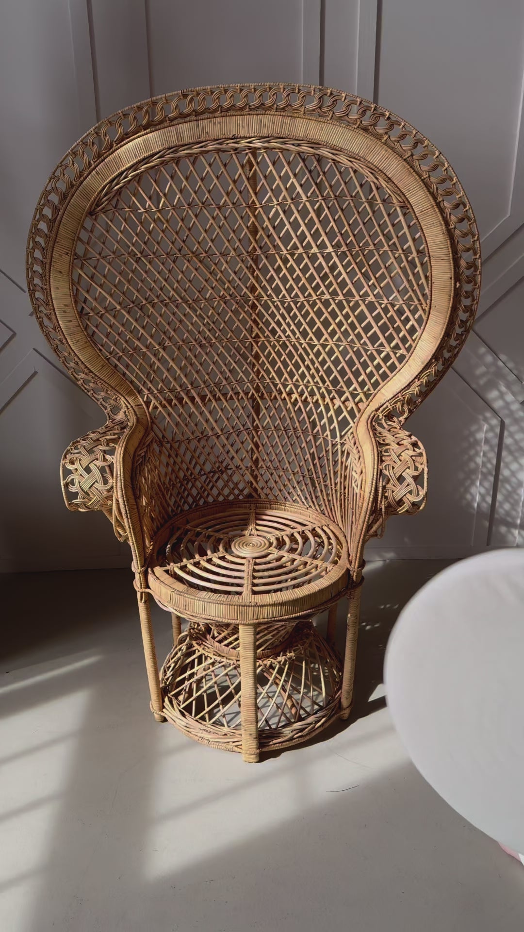 Die Form des Peacock Rattanstuhls erinnert an einen königlichen Thron, und genau so werden Sie sich auch fühlen, wenn Sie in ihm sitzen. Die natürlichen Farben des Rattans passen zu jeder Umgebung und sind perfekt auf die neuesten natürlichen Designtrends abgestimmt.